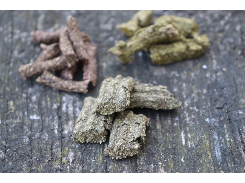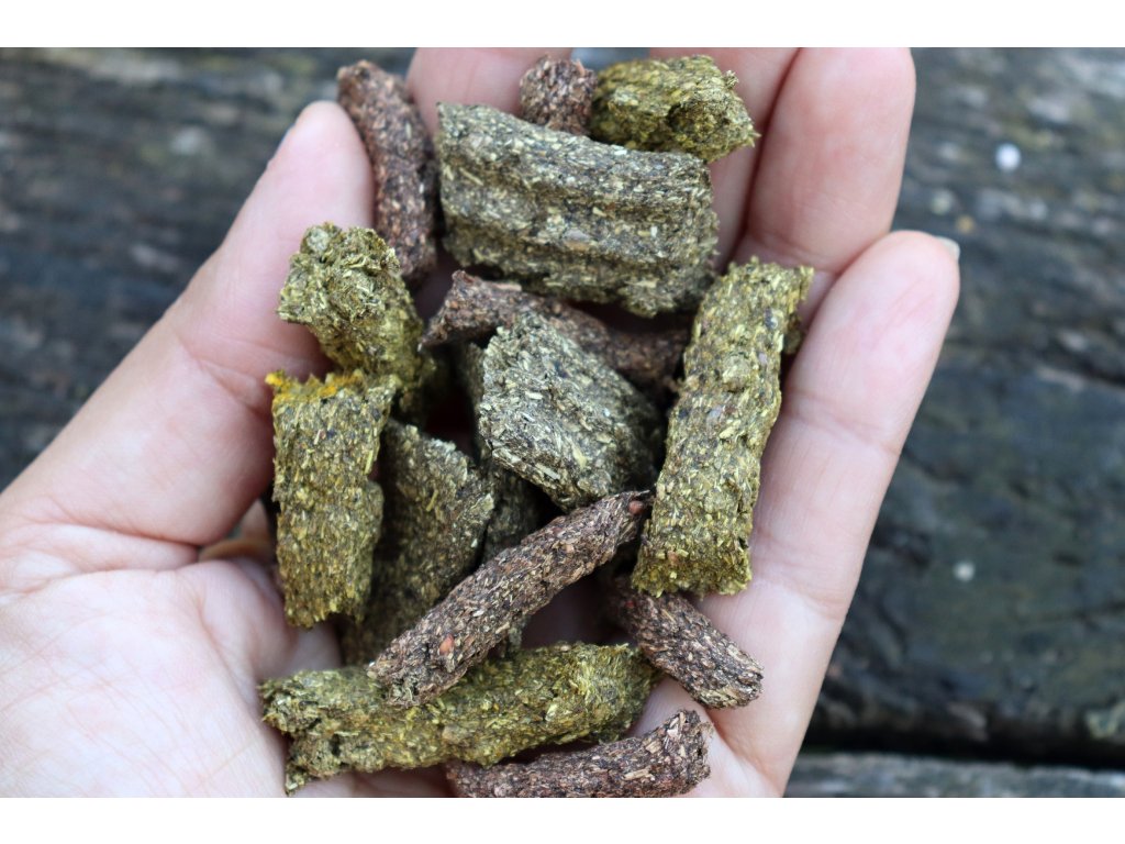 ZUSAMMENSETZUNG: Wiesenheu, Guar- oder Xanthan-Gummi, Kräutermischung (Brennnessel, Himbeerblätter, Minze, Spitzwegerich, Löwenzahn, Echinacea, Rosmarin), Apfelfaser, Inulin, Gemüschemehl (Rote Bete, Pastinaken, Karotten, Sellerie), Luzerne, Immunoglukane, Silymarin.