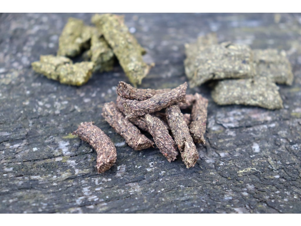 ZUSAMMENSETZUNG: Wiesenheu, Guar- oder Xanthan-Gummi, Kräutermischung (Brennnessel, Himbeerblätter, Minze, Spitzwegerich, Löwenzahn, Echinacea, Rosmarin), Apfelfaser, Inulin, Johannisbrot, Gemüschemehl (Pastinaken, Karotten, Sellerie), Luzerne, Immunoglukane, Silymarin.