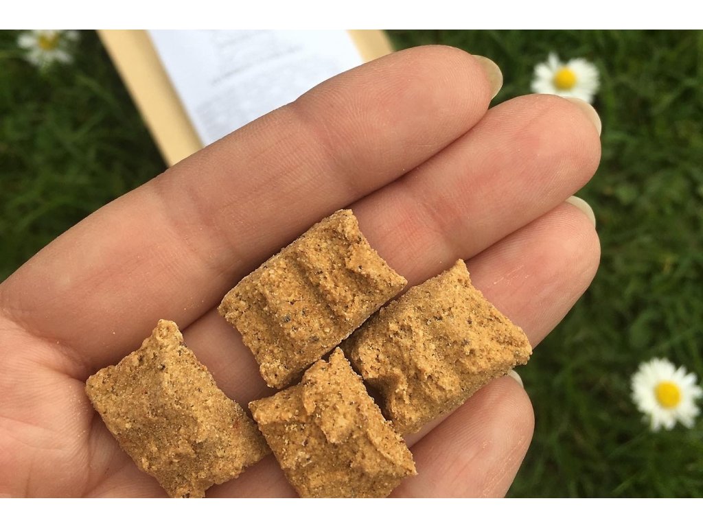 Složení: živočišné moučky (sardinková hydrolyzovaná moučka, játrová hydrolyzovaná moučka), tapioková mouka, bramborová vláknina, ovesná mouka bez lepku, guma guar, rozmarýnový prach