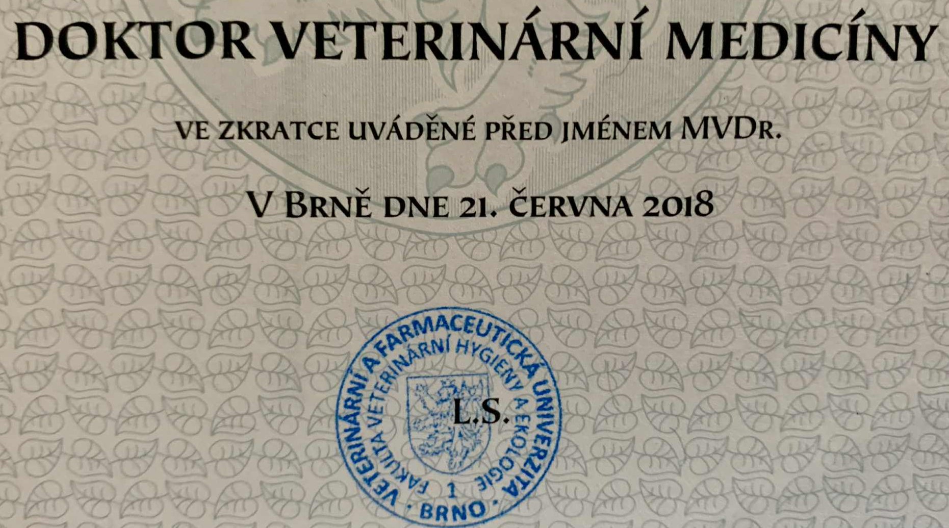 V roce 2018 jsem získala kýžený titul MVDr. - Doktor veterinární medicíny (latinsky medicinae veterinariae doctor)